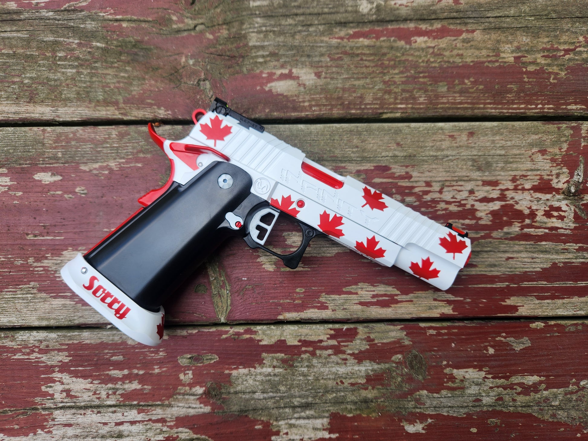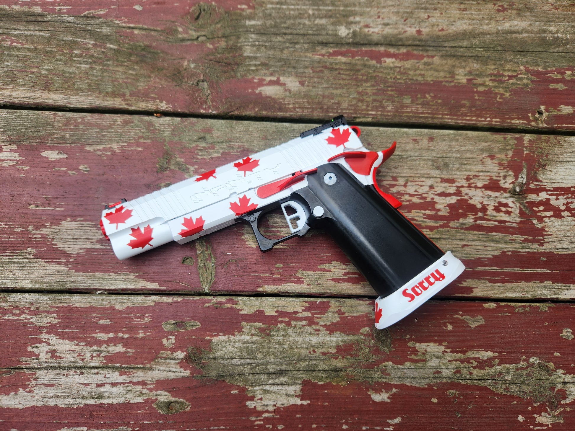 F-86 Custom "Infinitely Sorry" build showcases the Canadian flag colors with a white base and red maple leaves erratically thrown upon the slide, frame and mag well. "Sorry" is placed on the mag well so every time a player is eliminated in combat, they will know that the shooter is very apologetic for the inconvenience.