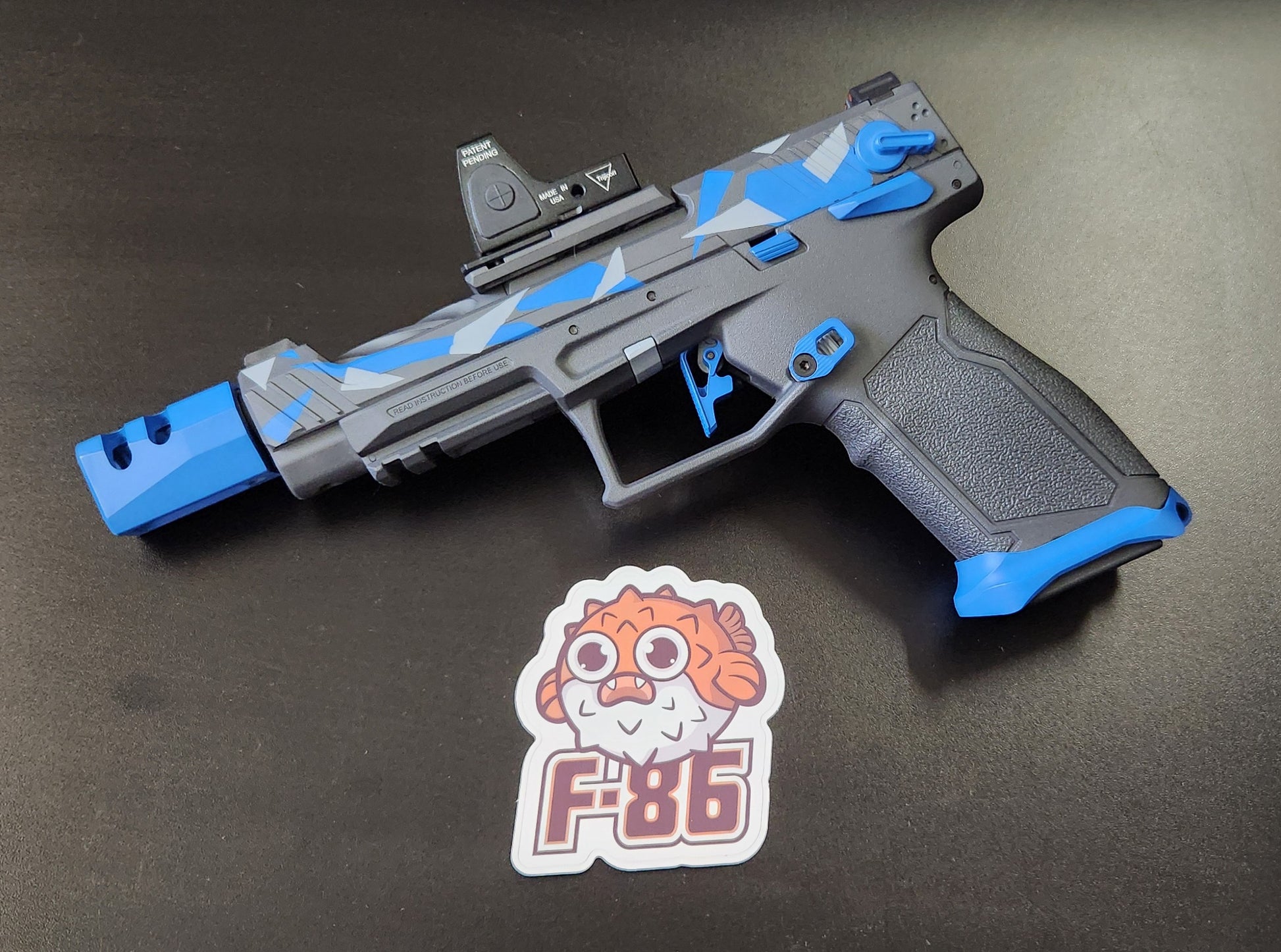 Built on the reliable Novritsch TP-22 platform, the SCB-22 is a precision-focused sidearm engineered for operators who demand both form and function. This custom build features F-86’s exclusive Splinter Camo Cerakote—a cold, angular finish layered in sniper grey, light grey, and ridgeway blue to reduce visual signature while projecting modern aggression.
